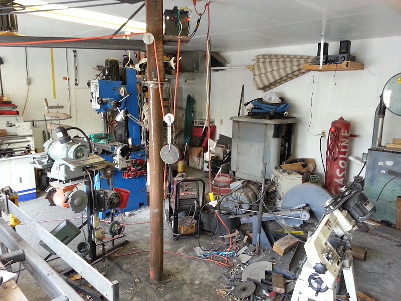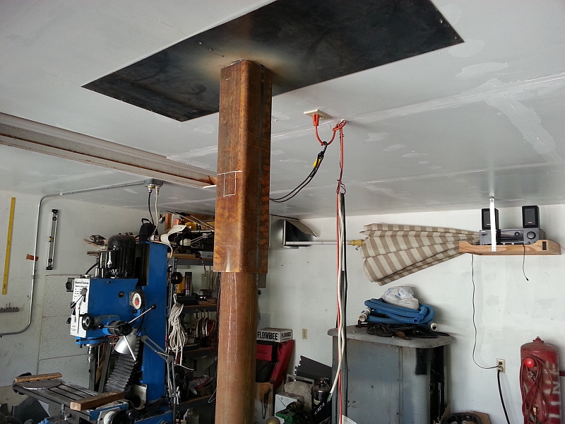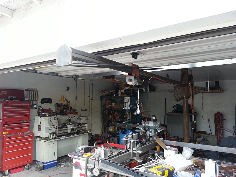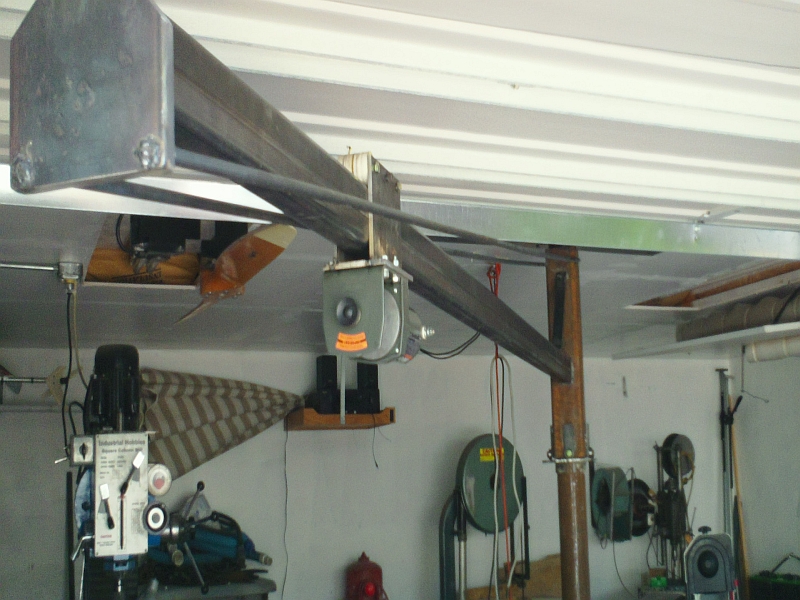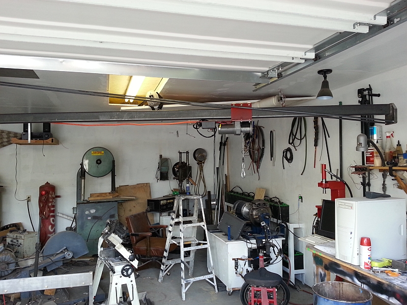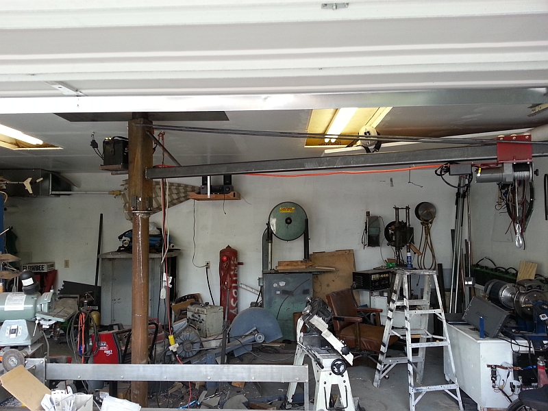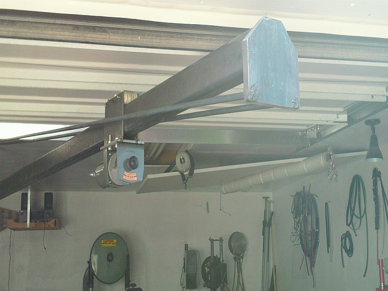 The jib will go out side the garage door by two feet. I have a 6 foot 6 inch clearance under it, so don't have to
